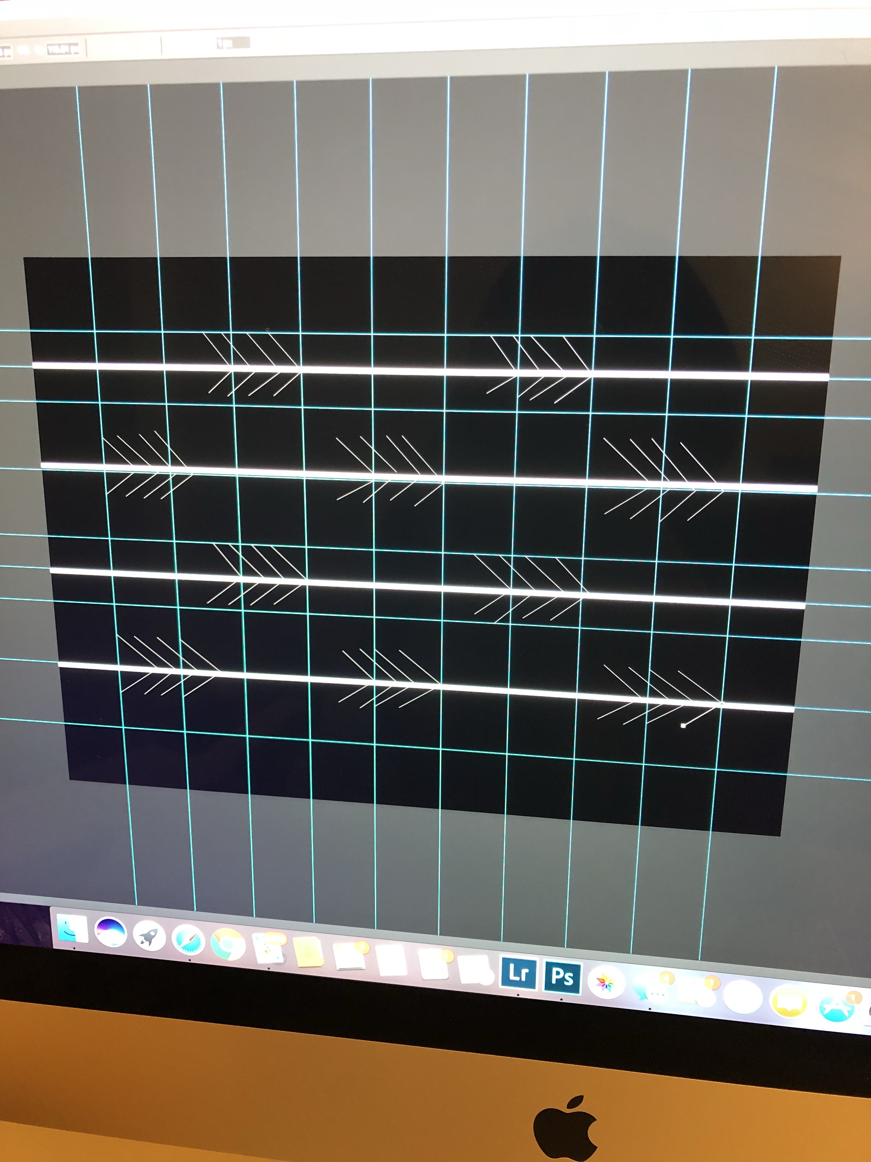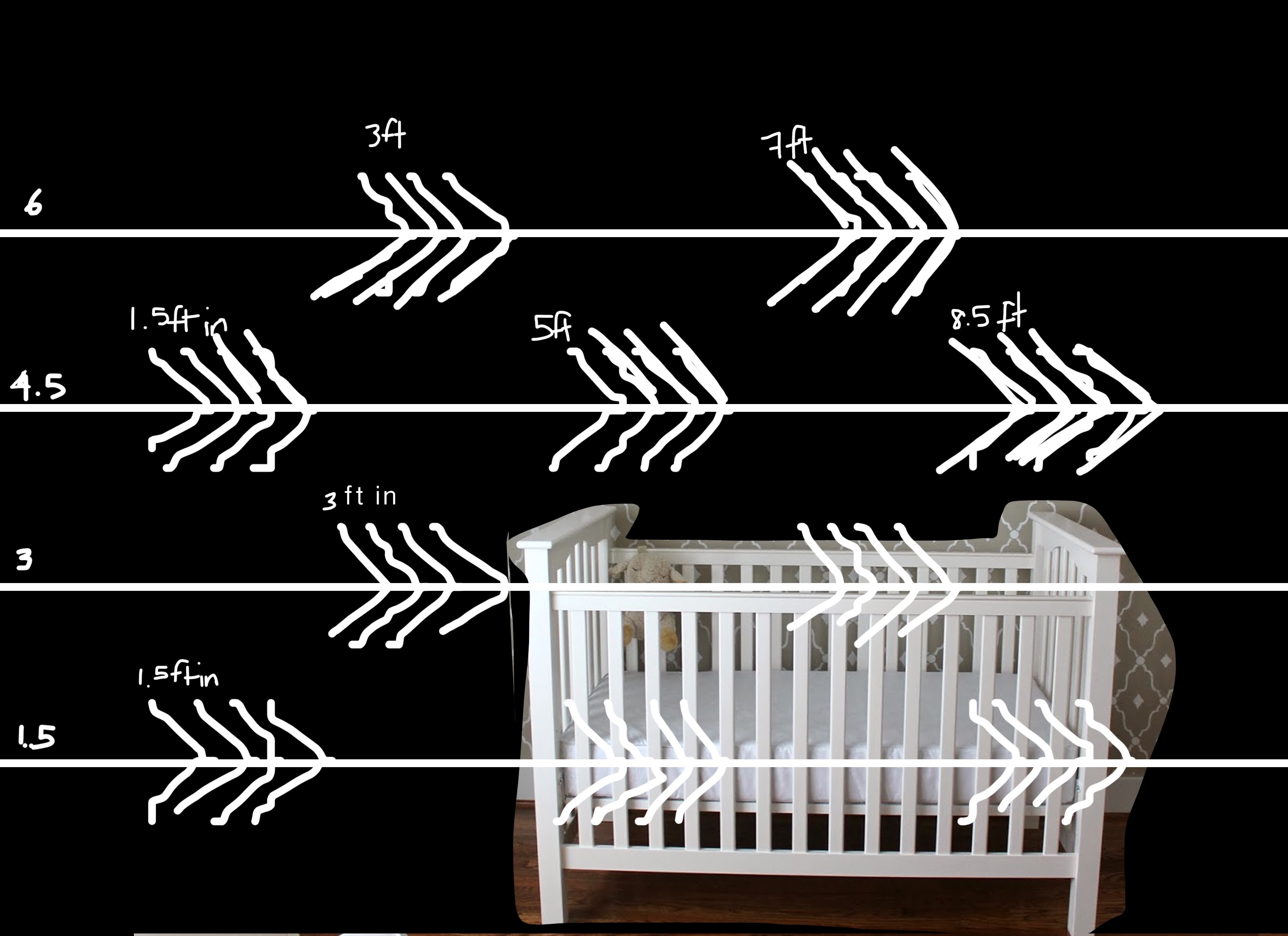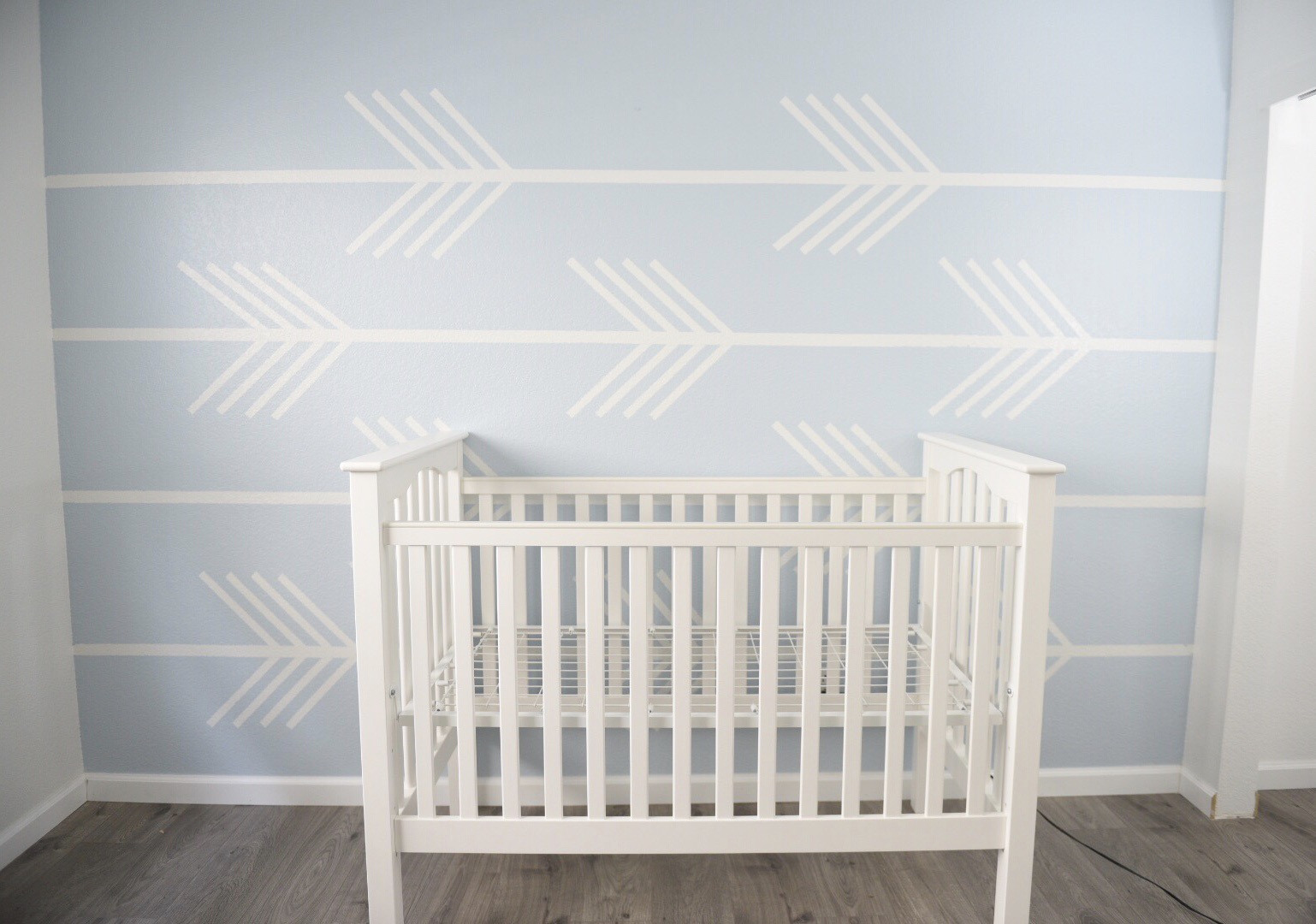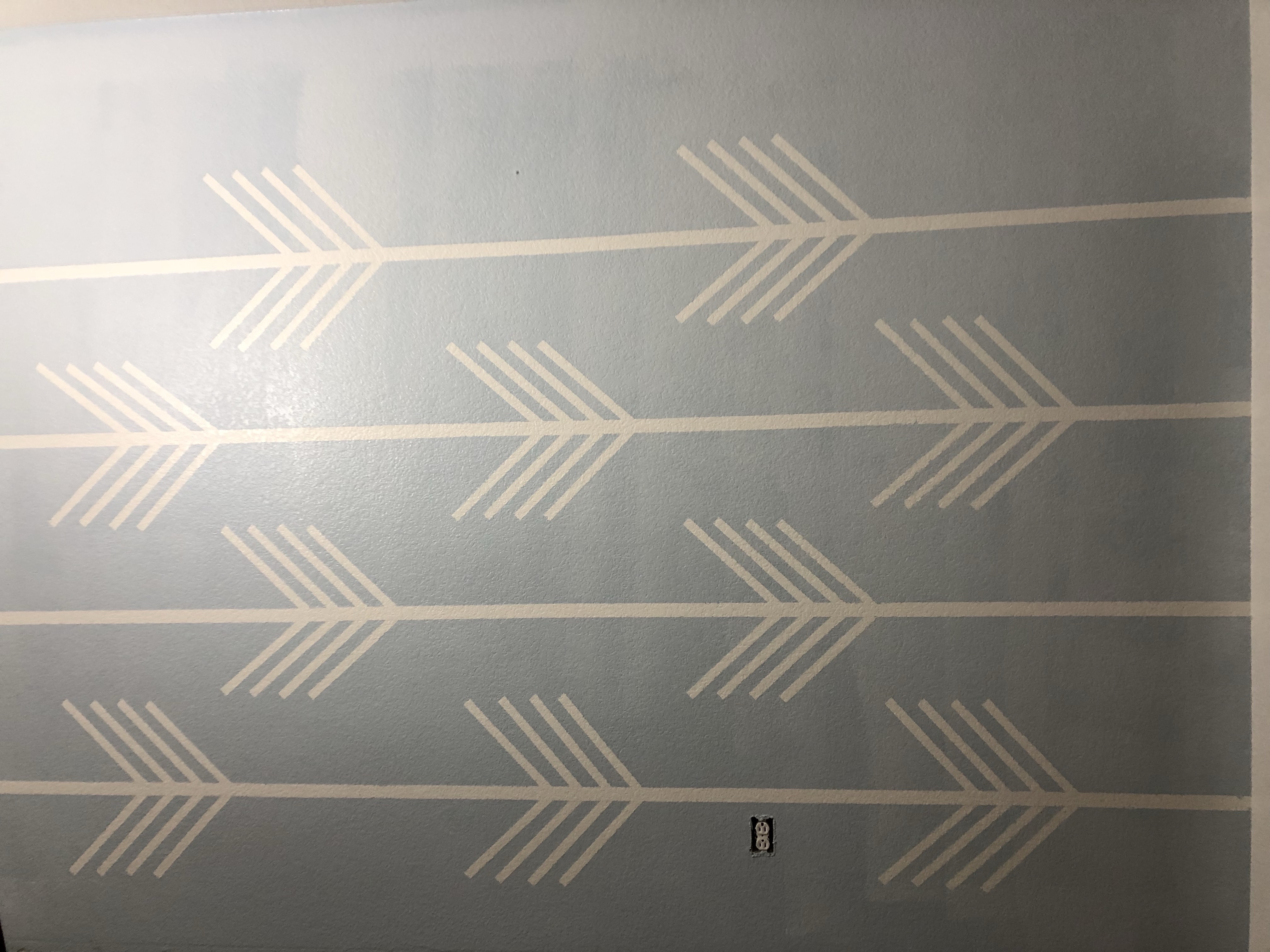 End up, London’s room is 8×11-ft. I pulled a picture of the Kendall crib I ordered online, took the measurements and pasted into proportion. The crib is 3 ft tall. Design wise, I started the first arrow line 1.5 ft from the bottom and make each arrow 1.5 ft apart. For the arrowheads, I alternated between 2 and 3 arrowheads for each line.