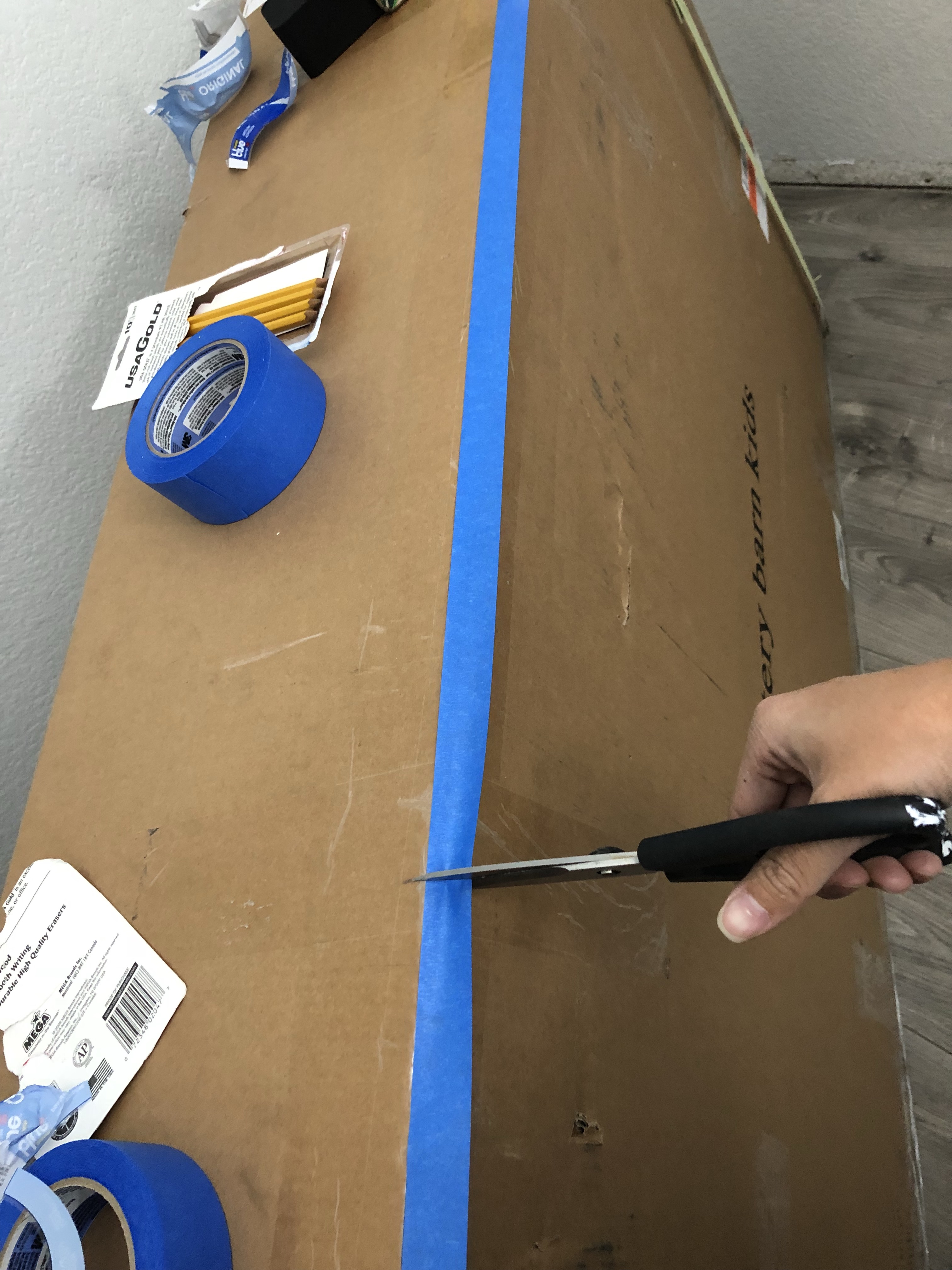 Each side of the arrow is 12-inch long. The best way to get a perfect cut is to have it slightly rested on an even surface. Since there’s no furniture in the room yet, I laid the tape out on the cardboard box, marked the 12-inch, 24-inch and 36-inch point (on the cardboard) and cut the tape appropriately.