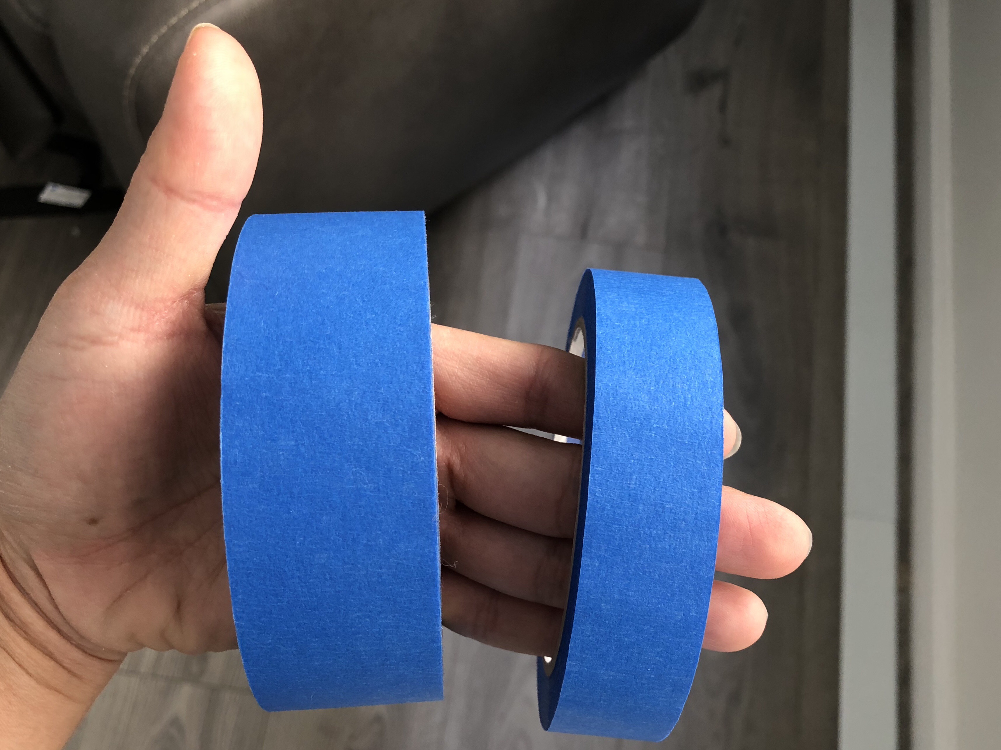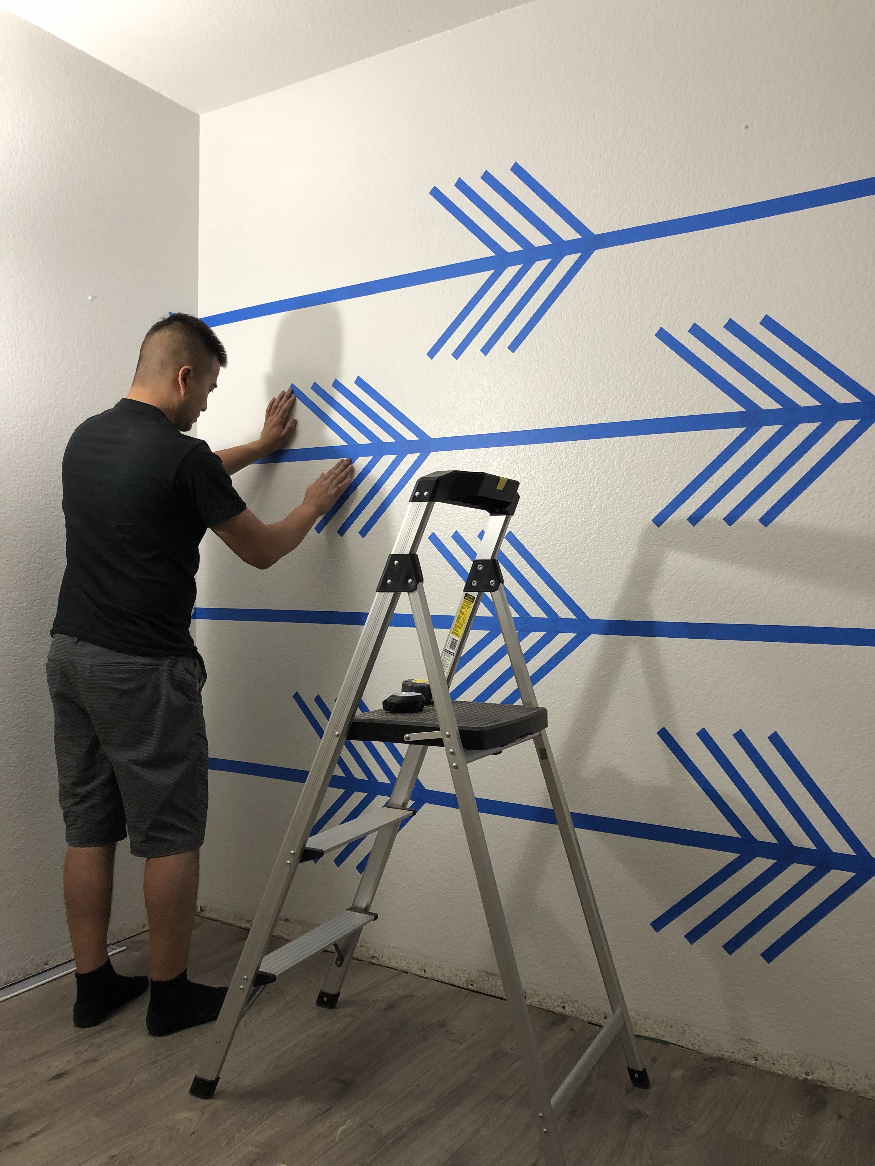 For the actual horizontal lines, my sister suggested making it thicker and the arrowhead more narrow since she likes the slender look more. It turned out to be an excellent idea. So Henry went out the next day and bought these two different sizes of painter tape:
